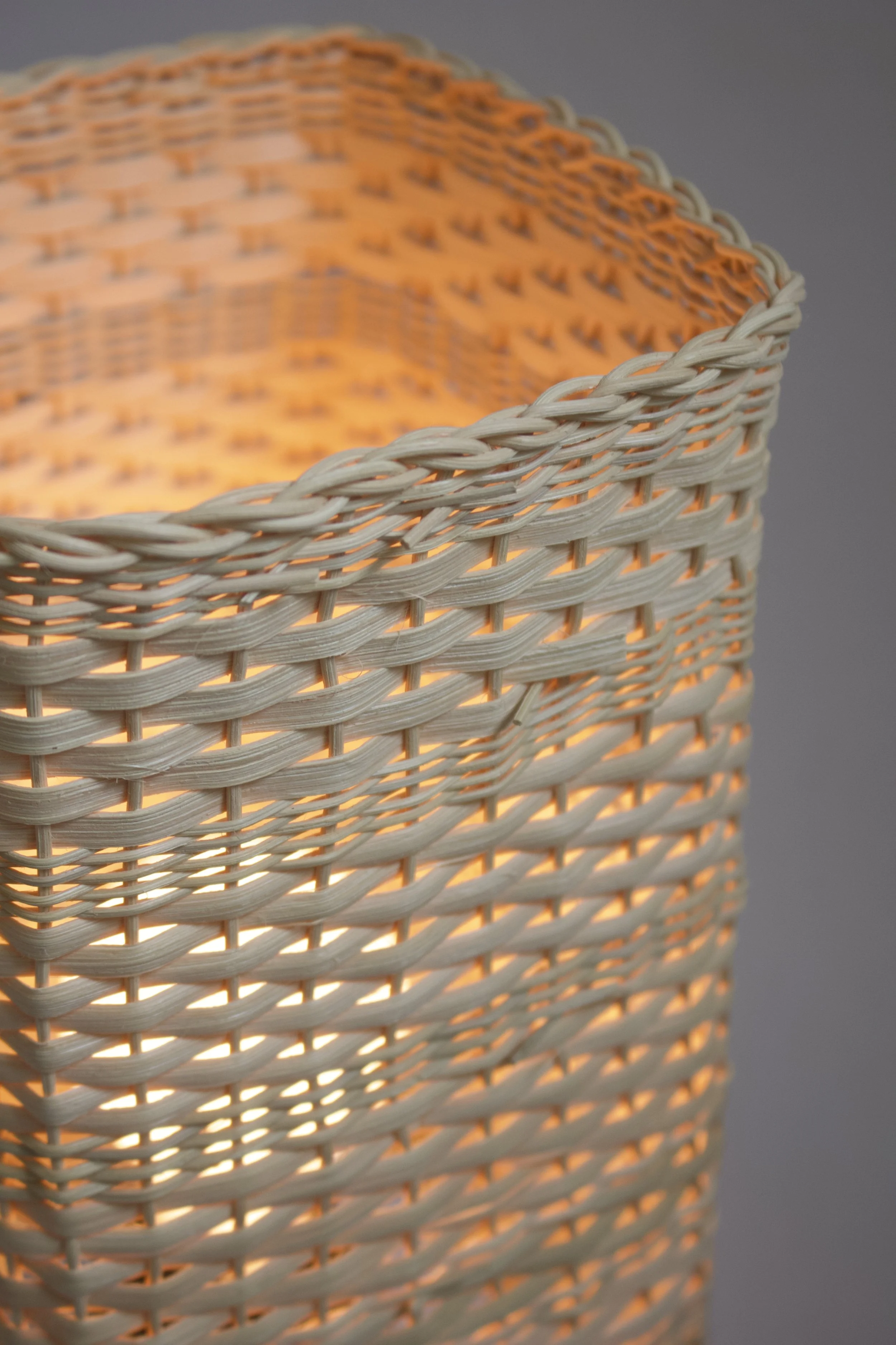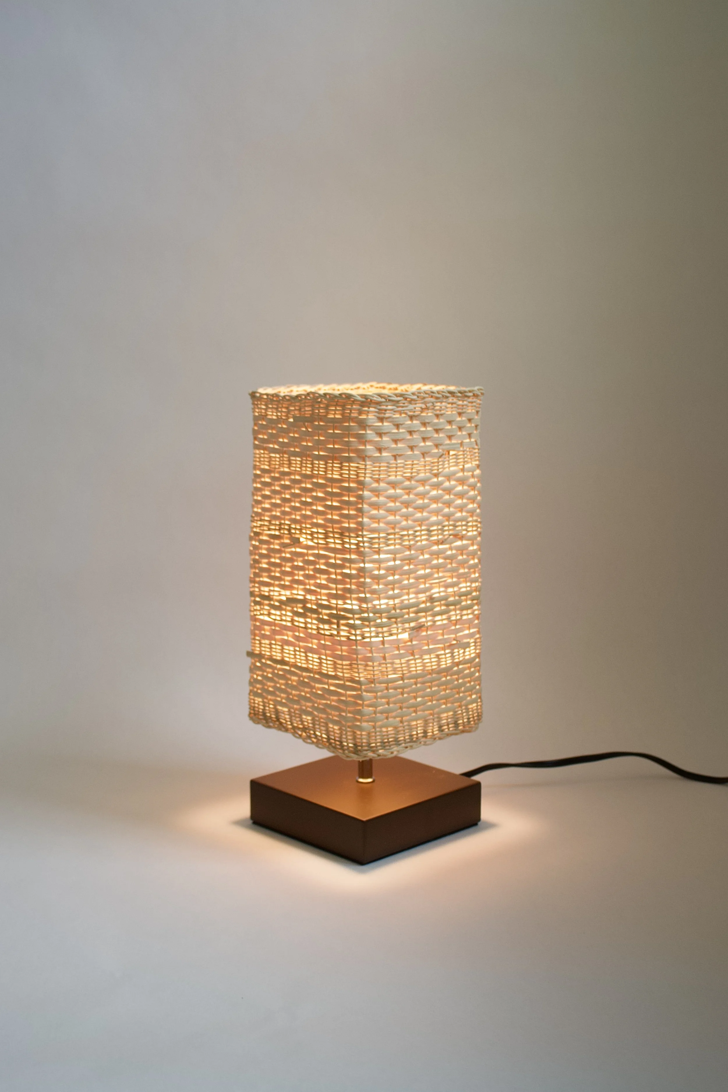 Reed woven on an oak wood base. Approximately 12.5”W x 24”H